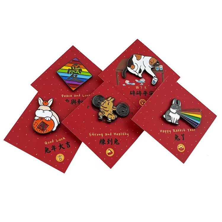 The premium Animal New Year Pins usher in the Year of the Rabbit with joyful whimsy. Crafted in soft enamel with vibrant colors and gold plating, each features a playful bunny in festive poses: holding a lucky red envelope (“Good Luck”), lifting weights (“Strong and Healthy”), rainbow pride (“Happy Rabbit Year”), rainbow “Love” (“Peace and Love”), and a quirky cow for fortune. Perfect for Lunar New Year celebrations.